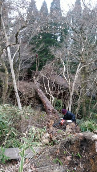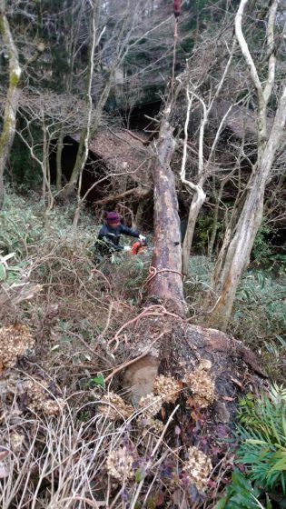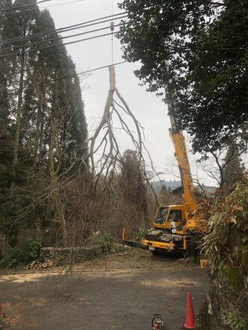 下にある家を潰さずにかろうじてとまっている状態でした。それをこれ以上倒れないようにラフター車輛で吊ってもらい切り手と吊りとで、上手い事コミュニケーションをとり、無事に作業完了しました!